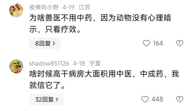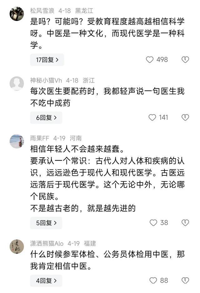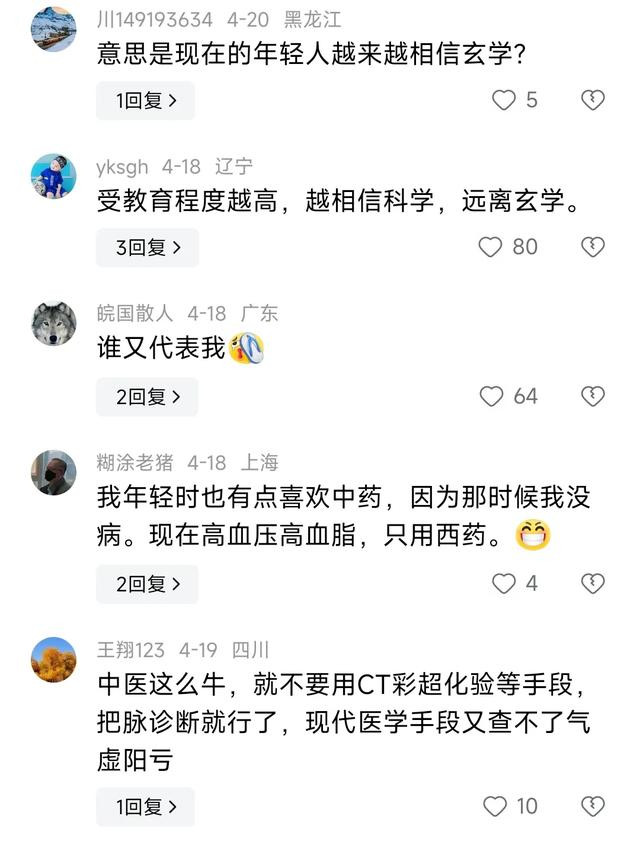 有网友认为,中医药就是玄学,而按常理来说,受教育程度越高,越年轻的人是不会相信玄学的。所以说现在年轻人越来越喜欢中医中药,是自我安慰,因为他本身就在这个岗位工作,只能说这样的话。而实际情况恰好相反。