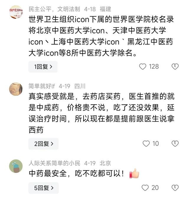 有网友称,如果中医药这么牛逼,为什么世界卫生组要将北京中医药大学等国内8所中医药大学除名?不承认这些大学的学术成果?这难道还不能证明,中医药已经已经被排除在现代医学科学体系之外?除了中国,世界其他国家并不承认中医药。这样的背景下,还敢吹越来越多的年轻人喜欢它,谁信?